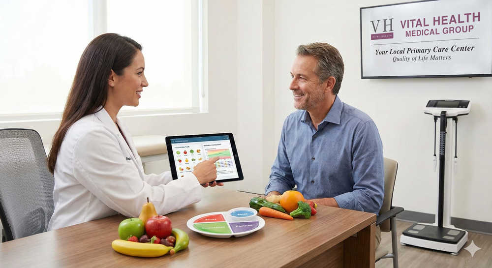 Nutrition is a core component of medical care at Vital Health Medical Group. Our clinical nutrition services are designed to support the prevention and management of chronic disease through individualized diet, physical activity, and metabolic assessment.
